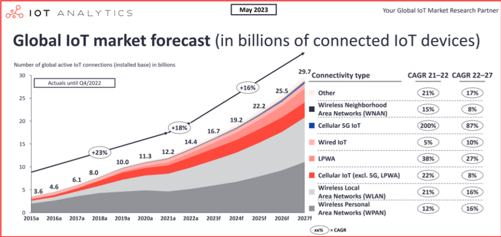 AIEC’s new AI-IoE (with self-adaptive networking, mesh-topology redundancy and saturated coverage) enters the IOT Market directly into the sector of LPWA (low power wide area), but increase the bandwidth covering audio. In the cart below LPWA (shown in orange color). With AI-IoE’s new contribution, the sector will increase exponentially.